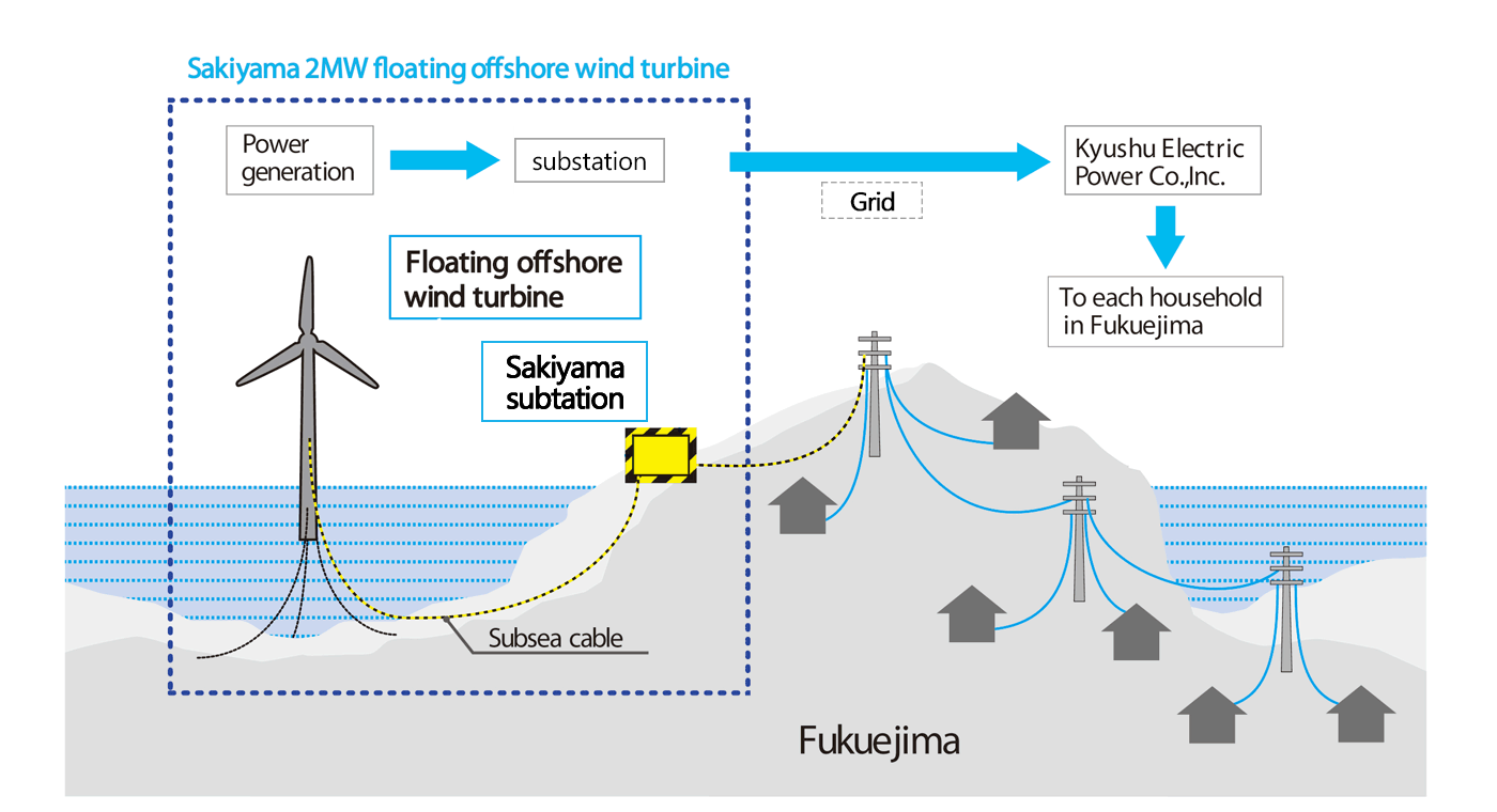 The Haenkaze is the first floating wind turbine in Japan. The power generated is sent through subsea cable and distributed to households via a substation.