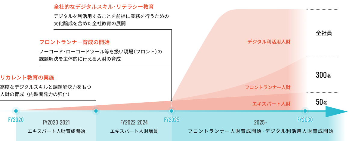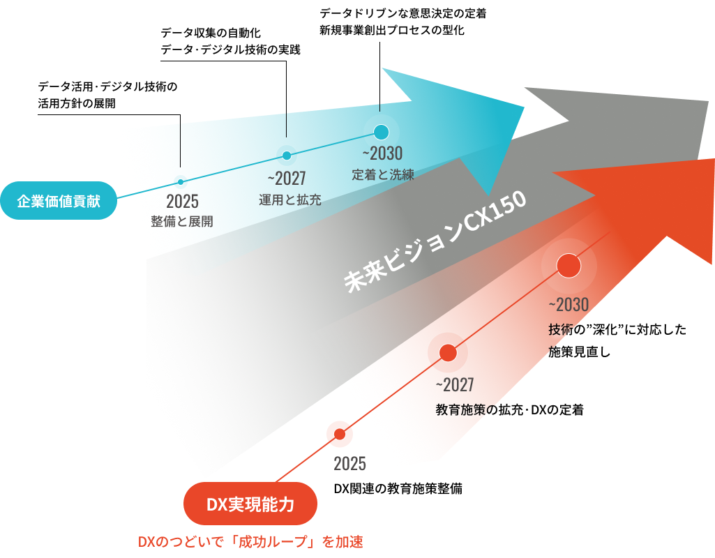 現在は、各事業で蓄積されたデータをつなぎ、利活用の精度を高めるフェーズに位置します。部門を超えた人と人のつながりを強め、組織全体が横断的にデジタル技術を活用できる体制を整えています。この取り組みを支えるデジタルプラットフォームを発展させ、協創社会における価値提供の基盤を構築してまいります。